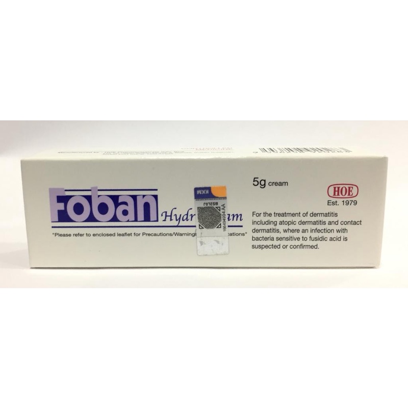 Fusidic acid 2.0% w/w, hydrocortisone 1.0% w/w. Apakah yang ada pada risalah ini. Per cream fusidic acid 2%, hydrocortisone 1%. Pastikan anda basuh tangan dengan bersih sebelum dan selepas menggunakan krim ini. Foban hydro cream diindikasikan untuk perawatan infeksi kulit, eksim atopik, impetigo, jerawat, eritrasma, abses, iritasi kulit, peradangan, ruam dan kondisi .